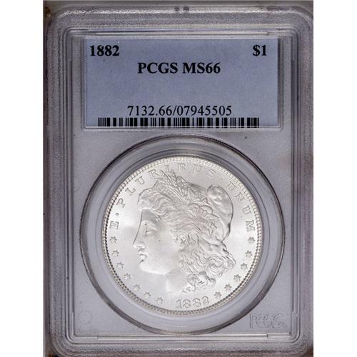 <B>1882<img border='0' src='http://www.heritagecoins.com/images/star.gif' width=10 height=10>$1> MS66 PCGS.</B></I> Whispers of faint tan-gold patination become slightly more noticeable on the reverse of this exquisitely struck Premium Gem. A couple of irrelevant luster grazes are noted on Liberty's cheek and in the left obverse field.