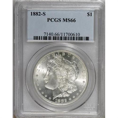 <B>1882-S $1 MS66 PCGS.</B></I> PCGS Population (3754/585). NGC Census: (5136/1322). Mintage: 9,250,000. Numismedia Wsl. Price for NGC/PCGS coin in MS66: $240. (#7140)<BR><BR><B>Coin Engraver:</B> George T. Morgan<BR><BR><b>Shipping:</b> Coins & Currency (<a target="_blank" href="http://www.heritageauctions.com/common/shipping.php">view shipping information</a>)
