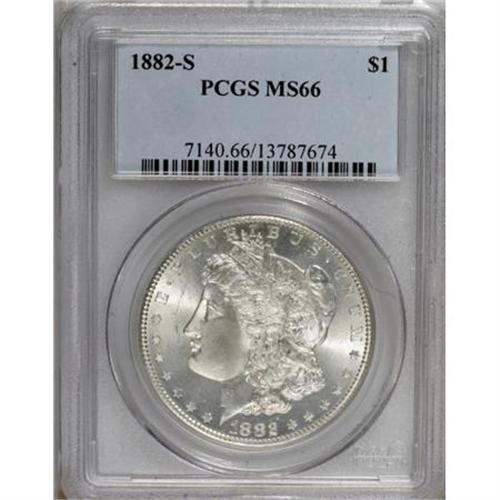 <B>1882-S $1 MS66 PCGS.</B></I> PCGS Population (3759/585). NGC Census: (5136/1322). Mintage: 9,250,000. Numismedia Wsl. Price for NGC/PCGS coin in MS66: $240. (#7140)<BR><BR><B>Coin Engraver:</B> George T. Morgan<BR><BR><b>Shipping:</b> Coins & Currency (<a target="_blank" href="http://www.heritageauctions.com/common/shipping.php">view shipping information</a>)