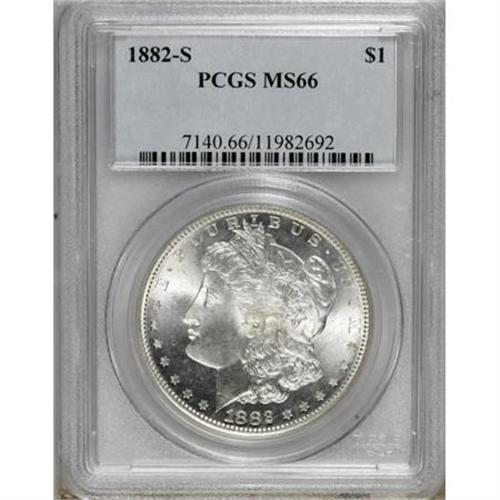 <B>1882-S $1 MS66 PCGS.</B></I> . PCGS Population (3808/602). NGC Census: (5231/1356). Mintage: 9,250,000. Numismedia Wsl. Price for NGC/PCGS coin in MS66: $240. (#7140)<BR><BR><B>Coin Engraver:</B> George T. Morgan<BR><BR><b>Shipping:</b> Coins & Currency (<a target="_blank" href="http://www.heritageauctions.com/common/shipping.php">view shipping information</a>)