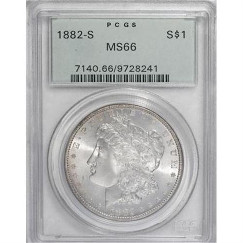 <B>1882-S $1 MS66 PCGS.</B></I> . PCGS Population (3808/602). NGC Census: (5231/1355). Mintage: 9,250,000. Numismedia Wsl. Price for NGC/PCGS coin in MS66: $240. (#7140)<BR><BR><B>Coin Engraver:</B> George T. Morgan<BR><BR><b>Shipping:</b> Coins & Currency (<a target="_blank" href="http://www.heritageauctions.com/common/shipping.php">view shipping information</a>)