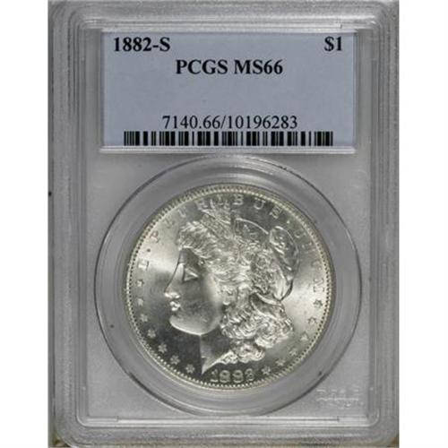 <B>1882-S $1 MS66 PCGS.</B></I> PCGS Population (3814/603). NGC Census: (5231/1356). Mintage: 9,250,000. Numismedia Wsl. Price for NGC/PCGS coin in MS66: $240. (#7140)<BR><BR><B>Coin Engraver:</B> George T. Morgan<BR><BR><b>Shipping:</b> Coins & Currency (<a target="_blank" href="http://www.heritageauctions.com/common/shipping.php">view shipping information</a>)