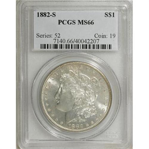 <B>1882-S $1 MS66 PCGS.</B></I> . PCGS Population (3811/602). NGC Census: (5231/1356). Mintage: 9,250,000. Numismedia Wsl. Price for NGC/PCGS coin in MS66: $240. (#7140)<BR><BR><B>Coin Engraver:</B> George T. Morgan<BR><BR><b>Shipping:</b> Coins & Currency (<a target="_blank" href="http://www.heritageauctions.com/common/shipping.php">view shipping information</a>)