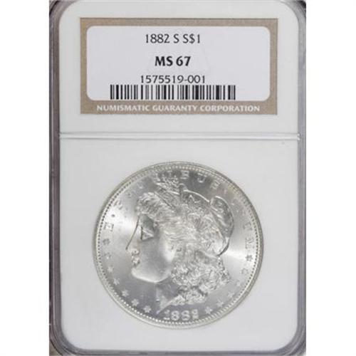 <B>1882-S $1 MS67 NGC.</B></I> Pristine surfaces and brilliant throughout with blazing mint luster. A large number of '82-S dollars were set aside, and they were almost all well-made coins.<BR><BR><b>Shipping:</b> Coins & Currency (<a target="_blank" href="http://www.heritageauctions.com/common/shipping.php">view shipping information</a>)
