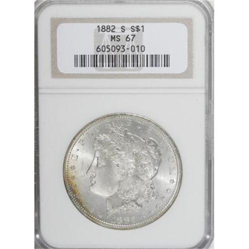 <B>1882-S $1 MS67 NGC.</B></I> Sea-green dominates the reverse, although the border offers glimpses of fire-red and gold. The obverse is mostly brilliant, but slender bands of golden-brown and powder-blue hug the lower left border. A well struck example with a smooth cheek and minor contact on the eagle's breast.<BR><I>From the Reuben Reinstein Collection.</B></I><BR><BR><b>Shipping:</b> Coins & Currency (<a target="_blank" href="http://www.heritageauctions.com/common/shipping.php">view shipping information</a>)