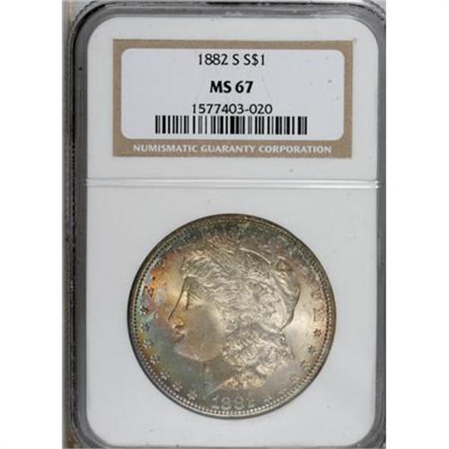 <B>1882-S $1 MS67 NGC.</B></I> A sharply struck and highly lustrous example of this common date dollar. The centers of each side are mostly brilliant and then surrounded by rose and golden toning. Exceptional quality.<BR><BR><B>Coin Engraver:</B> George T. Morgan<BR><BR><b>Shipping:</b> Coins & Currency (<a target="_blank" href="http://www.heritageauctions.com/common/shipping.php">view shipping information</a>)