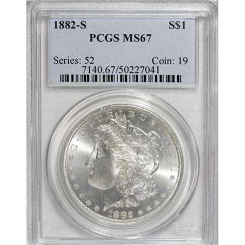 <B>1882-S $1 MS67 PCGS.</B></I> Vibrant luster and well struck design elements abound on this beautiful Superb Gem. Untoned surfaces are impeccably preserved.<BR><BR><B>Coin Engraver:</B> George T. Morgan<BR><BR><b>Shipping:</b> Coins & Currency (<a target="_blank" href="http://www.heritageauctions.com/common/shipping.php">view shipping information</a>)