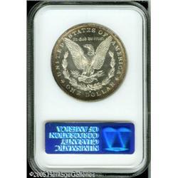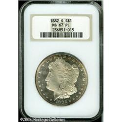 <B>1882-S<img border='0' src='http://www.heritagecoins.com/images/star.gif' width=10 height=10>$1 MS67 Prooflike NGC.</B></I> This amazing Superb Gem displays sharply struck features throughout, charcoal-gray color in the mightily reflective fields, and incredible frosting on the bone-white devices. A few tiny field marks do little to reduce the overall visual effect of this splendid piece, which is further enhanced by lovely peripheral toning on both obverse and reverse.<BR><I>From The Dr. Volker Dube Collection.</B></I> Lot:7227