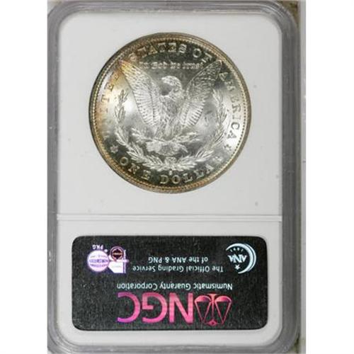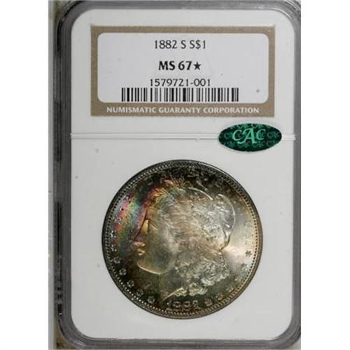 <B>1882-S $1 MS67 <img src="/images/star.gif" width="10" height="10" alt="" border="0"> NGC. CAC.</B></I> Swirling luster radiates from the impeccably preserved surfaces of this gorgeous Superb Gem that was assigned the Star designation. Medium intensity toning visits the margins, somewhat more extensive on the obverse. Census: 58 in 67 <B><img src="/images/star.gif" width="10" height="10" alt="" border="0"></B></I>, 4 finer with Star (1/08).<BR><BR><B>Coin Engraver:</B> George T. Morgan<BR><BR><b>Shipping:</b> Coins & Currency (<a target="_blank" href="http://www.heritageauctions.com/common/shipping.php">view shipping information</a>)