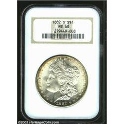 <TABLE cellSpacing=0 cellPadding=0 width="100%" bgColor=#000000 border=0><TBODY><TR><TD width="100%"><TABLE cellSpacing=1 cellPadding=3 width="100%" border=0><TBODY><TR><TD width="100%" bgColor=#79735c><FONT face=arial color=#ffffff size=3><B>Description</B> </FONT></TD></TR><TR><TD width="100%" bgColor=#ffffff><FONT face=arial size=2><B>1882-S $1 MS68 NGC.</B></I> Golden-brown patina hugs the peripheries, while the centers are fully brilliant. A needle-sharp Superb Gem that has flashy luster and a virtually pristine obverse. The reverse is also splendidly preserved. The mintmark lacks complete definition, but this does not affect the stupendous eye appeal. Tied for the finest graded by NGC, with approximately one example certified for each year that NGC has been in business. Population: 15 in 68, 0 finer (7/03). </FONT></TD></TR></TBODY></TABLE></TD></TR></TBODY></TABLE><BR><A name=PricesRealized></A><TABLE cellSpacing=0 cellPadding=0 width="100%" bgColor=#000000 border=0><TBODY><TR><TD width="100%"><TABLE cellSpacing=1 cellPadding=3 width="100%" border=0><TBODY><TR><TD width="100%" bgColor=#79735c><A name=PR><FONT face=arial color=#ffffff size=3><B>Previous Prices from Heritage Auctions</B> </FONT></A></TD></TR><TR><TD bgColor=#f6f6ed><TABLE cellSpacing=0 cellPadding=0 width="100%" border=1><TBODY><TR><TD align=middle width="33%"><B>Date</B></TD><TD align=middle width="33%"><B>Service</B></TD><TD align=middle width="33%"><B>Price</B></TD></TR><TR bgColor=whitesmoke><TD width="33%"><B>11/23/2002</B></TD><TD width="33%">PCGS</TD><TD width="33%">$3,565.00</TD></TR><TR bgColor=whitesmoke><TD width="33%"><B>02/18/2002</B></TD><TD width="33%">PCGS</TD><TD width="33%">$3,105.00</TD></TR><TR bgColor=whitesmoke><TD width="33%"><B>01/09/2002</B></TD><TD width="33%">PCGS</TD><TD width="33%">$2,185.00</TD></TR><TR bgColor=whitesmoke><TD width="33%"><B>08/09/2000</B></TD><TD width="33%">PCGS</TD><TD width="33%">$2,185.00</TD></TR><TR bgColor=whitesmoke><TD width="33%"><B>08/09/2000</B></TD><TD width="33%">PCGS</TD><TD width="33%">$1,265.00</TD></TR><TR bgColor=whitesmoke><TD width="33%"><B>09/13/1997</B></TD><TD width="33%">PCGS</TD><TD width="33%">$3,450.00</TD></TR><TR bgColor=whitesmoke><TD width="33%"><B>04/01/1999</B></TD><TD width="33%">PCGS</TD><TD width="33%">$3,632.00</TD></TR><TR bgColor=whitesmoke><TD width="33%"><B>05/01/1999</B></TD><TD width="33%">PCGS</TD><TD width="33%">$2,970.00</TD></TR><TR bgColor=whitesmoke><TD width="33%"><B>01/07/2000</B></TD><TD width="33%">PCGS</TD><TD width="33%">$4,025.00</TD></TR><TR bgColor=whitesmoke><TD width="33%"><B>01/07/2000</B></TD><TD width="33%">PCGS</TD><TD width="33%">$2,760.00</TD></TR><TR bgColor=whitesmoke><TD width="33%"><B>05/29/1996</B></TD><TD width="33%">NGC</TD><TD width="33%">$3,300.00</TD></TR><TR bgColor=whitesmoke><TD width="33%"><B>11/01/1998</B></TD><TD width="33%">NGC</TD><TD width="33%">$2,070.00</TD></TR><TR bgColor=whitesmoke><TD width="33%"><B>01/01/1999</B></TD><TD width="33%">NGC</TD><TD width="33%">$2,530.00</TD></TR><TR bgColor=whitesmoke><TD width="33%"><B>09/10/1993</B></TD><TD width="33%">NGC</TD><TD width="33%">$4,235.00</TD></TR></TBODY></TABLE></TD></TR><TR><TD bgColor=#ffffff><FONT face=arial size=1 ?>PLEASE NOTE: All prices realized reflect the final hammer price PLUS the buyer's premium in auctions that charge a buyer's premium. Each item has a notation at the top of the listing indicating whether that lot included a buyer's premium. Example: A item that sells with a final hammer price of $100 and a 20% buyer's premium will display with a price realized of $120. All information listed is intended to be as accurate as possible, but errors are possible. Please use this guide carefully and inform us of any inaccuracies. </FONT></TD></TR></TBODY></TABLE></TD></TR></TBODY></TABLE><BR><TABLE cellSpacing=0 cellPadding=0 width="100%" bgColor=#000000 border=0><TBODY><TR><TD width="100%"><TABLE cellSpacing=1 cellPadding=3 width="100%" border=0><TBODY><TR><TD width="100%" bgColor=#79735c colSpan=6><FONT face=arial color=#ffffff size=3><B>Price Guide*</B> </FONT></TD></TR><TR bgColor=#f6f6ed><TD align=middle><B>Grade</B> </TD><TD align=middle><B>Coin World<BR>(Trends)</B> </TD><TD align=middle><B>Numismedia<BR>Retail</B> </TD><TD align=middle><B>Numismedia<BR>Wholesale</B> </TD><TD align=middle><B>Coin<BR>Universe</B> </TD><TD align=middle><B>Heritage<BR>Value Index</B> </TD></TR><TR bgColor=#ffffff><TD align=middle>67</TD><TD align=right>---</TD><TD align=right>$910.00</TD><TD align=right>$725.00</TD><TD align=right>$1,200.00</TD><TD align=right>$759.58</TD></TR><TR style="FONT-WEIGHT: bold" bgColor=#cccfdd><TD align=middle>68</TD><TD align=right>---</TD><TD align=right>---</TD><TD align=right>$2,475.00</TD><TD align=right>---</TD><TD align=right>---</TD></TR><TR bgColor=#ffffff><TD align=middle>69</TD><TD align=right>---</TD><TD align=right>---</TD><TD align=right>---</TD><TD align=right>---</TD><TD align=right>---</TD></TR><TR bgColor=#ffffff><TD colSpan=6><FONT size=1>*All information listed is intended to be as accurate as possible, but errors are possible. No item may be returned or refused based on this information which is provided as a service to our customers. You should contact each pricing source directly to determine the accuracy of this information. </FONT></TD></TR></TBODY></TABLE></TD></TR></TBODY></TABLE><BR><TABLE cellSpacing=0 cellPadding=0 width="100%" bgColor=#000000 border=0><TBODY><TR><TD width="100%"><TABLE cellSpacing=1 cellPadding=3 width="100%" border=0><TBODY><TR><TD width="100%" bgColor=#79735c><FONT face=arial color=#ffffff size=3><B>Population Guide</B> </FONT></TD></TR><TR bgColor=#ffffff><TD align=middle><!-- Begin Output of Population Grid--><TABLE cellSpacing=0 cellPadding=0 width="100%" border=0><TBODY><TR><TD vAlign=center><TABLE cellSpacing=0 width="100%" border=1 cellsadding="3"><TBODY><TR><TD vAlign=center><TABLE cellSpacing=0 cellPadding=3 width="100%" border=1><TBODY><TR><TD vAlign