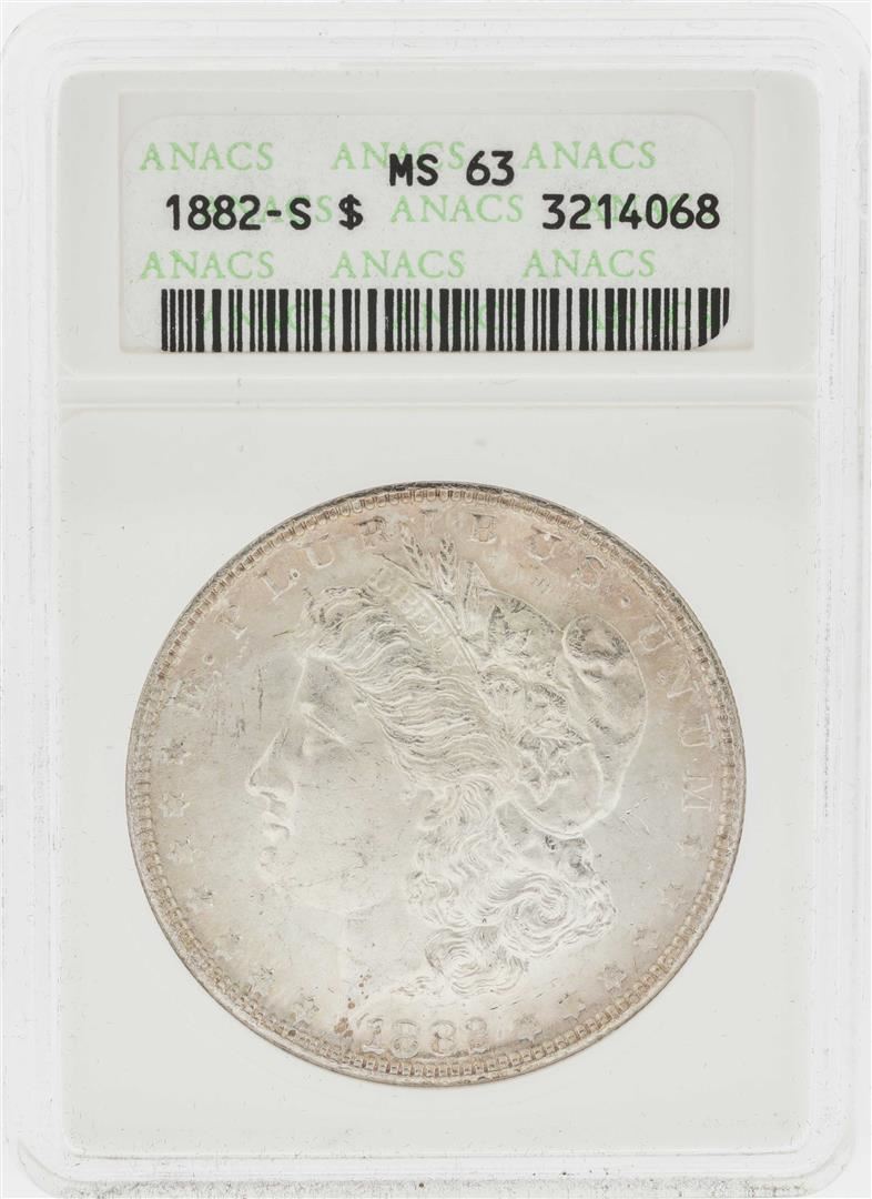 One 1882-S $1 Morgan Silver Dollar Coin ANACS MS63. ANACS Certified.