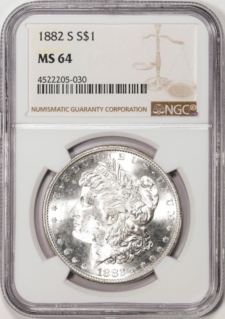 One 1882-S $1 Morgan Silver Dollar Coin NGC MS64. NGC Certified.