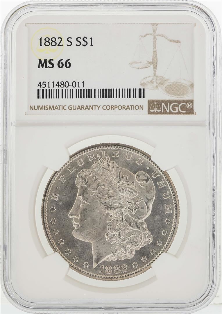 One 1882-S $1 Morgan Silver Dollar Coin NGC MS66. NGC Certified.