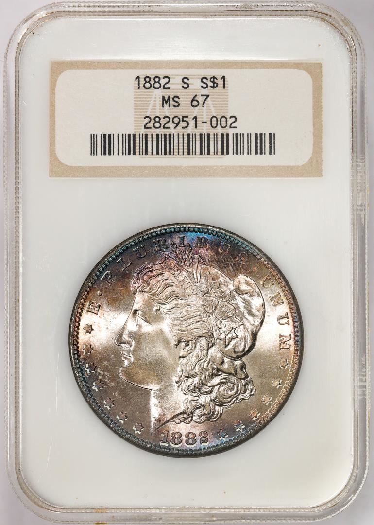 One 1882-S $1 Morgan Silver Dollar Coin NGC MS67 Old Fatty Holder Amazing Toning. NGC Certified.