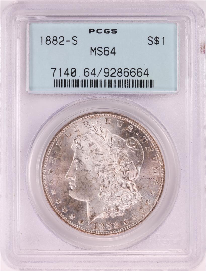 One 1882-S $1 Morgan Silver Dollar Coin PCGS MS64 Old Green Holder. PCGS Graded.
