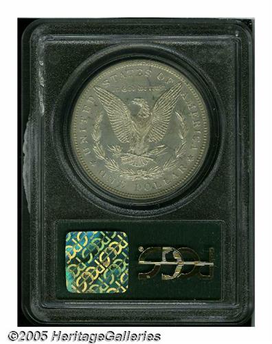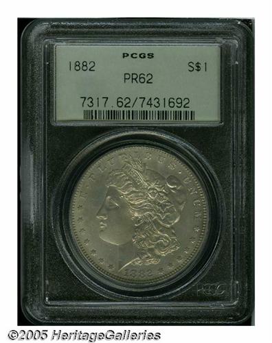 <B>1882<S$1> PR62 PCGS.</B></I> A thin layer of golden-gray patina overlays each side, and a slightly darker gold toning streak runs vertically at the front of Liberty's cheek. There is some field to device contrast, but the surfaces overall are a bit subdued. The design elements are exquisitely struck throughout, and there are no mentionable abrasions. A few wispy hairlines are visible under magnification.