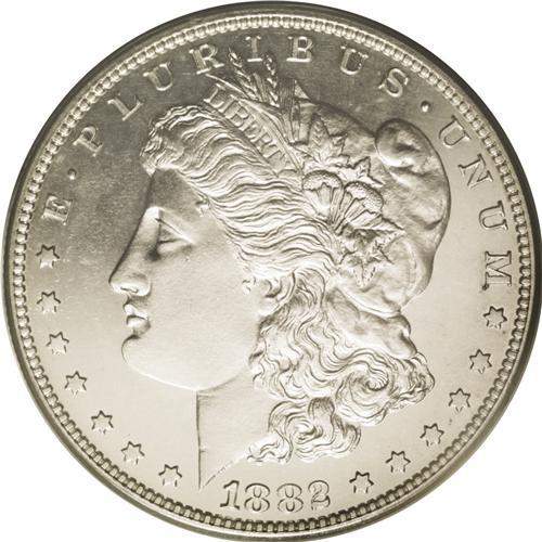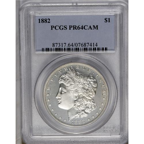<B>1882<img border='0' src='http://www.heritagecoins.com/images/star.gif' width=10 height=10>$1> PR64 Cameo PCGS.</B></I> Essentially untoned with only the slightest hint of silver-gray patina over each side. A sharply struck example with a presentable cameo finish. Limited in grade by light hairlining in the fields. Population: 18 in 64 Cameo, 12 finer (6/06).