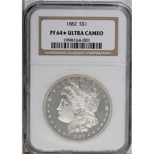 <B>1882 S$1 PR64 <img border='0' src='http://www.heritagecoins.com/images/star.gif' width=10 height=10> Ultra Cameo NGC.</B></I> Only the most attractive and aesthetically desirable coins receive the <img border='0' src='http://www.heritagecoins.com/images/star.gif' width=10 height=10> designation from NGC, and this example certainly has all of the qualifications. Both sides are fully brilliant with splendid silver-white color. The sharply defined devices have intense and radiant mint frost, while the surrounding fields are deeply mirrored. A couple short hairlines in the right obverse field certainly account for the diminished numerical grade. Over the years, NGC has certified 318 proof 1882 Morgan dollars, yet just four coins out of that total have received the <img border='0' src='http://www.heritagecoins.com/images/star.gif' width=10 height=10> designation. The other three grade PR68, PR67 Ultra Cameo, and PR68 Ultra Cameo. It is also important to recognize that just nine of those 318 pieces have been given the Ultra Cameo designation, in all different grades.<BR><BR><b>Shipping:</b> Coin/Currency (<a target="_blank" href="http://www.heritageauctions.com/common/shipping.php">view shipping information</a>)