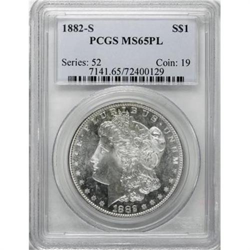 <B>1882-S $1 MS65 Prooflike PCGS.</B></I> . PCGS Population (413/68). NGC Census: (601/181). Numismedia Wsl. Price for NGC/PCGS coin in MS65: $220. (#7141)<BR><BR><B>Coin Engraver:</B> George T. Morgan<BR><BR><b>Shipping:</b> Coins & Currency (<a target="_blank" href="http://www.heritageauctions.com/common/shipping.php">view shipping information</a>)