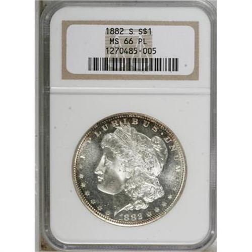 <B>1882-S $1 MS66 Prooflike NGC.</B></I> NGC Census: (163/15). PCGS Population (64/4). Numismedia Wsl. Price for NGC/PCGS coin in MS66: $525. (#7141)<BR><BR><B>Coin Engraver:</B> George T. Morgan<BR><BR><b>Shipping:</b> Coins & Currency (<a target="_blank" href="http://www.heritageauctions.com/common/shipping.php">view shipping information</a>)