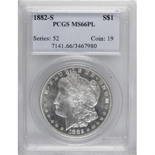 <B>1882-S $1 MS66 Prooflike PCGS.</B></I> PCGS Population (63/4). NGC Census: (159/15). Numismedia Wsl. Price for NGC/PCGS coin in MS66: $525. (#7141)<BR><I>From The Diamond Head Registry Set of Prooflike Dollars.</B></I><BR><BR><B>Coin Engraver:</B> George T. Morgan<BR><BR><b>Shipping:</b> Coins & Currency (<a target="_blank" href="http://www.heritageauctions.com/common/shipping.php">view shipping information</a>\)