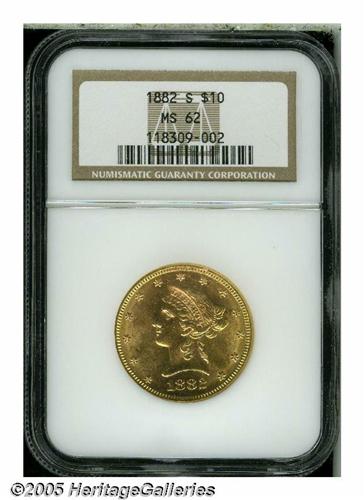 <B>1882-S<$10> MS62 NGC.</B></I> Blazing luster, a pinpoint strike, and relatively clean surfaces ensure the eye appeal of this frosty tough date Eagle. Population: 59 in 62, 16 finer (4/05).