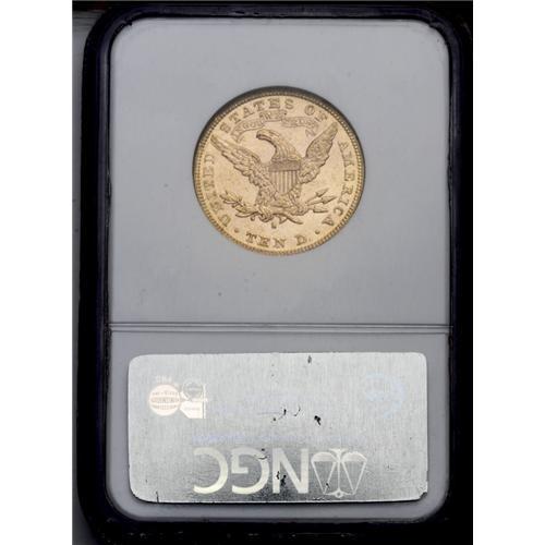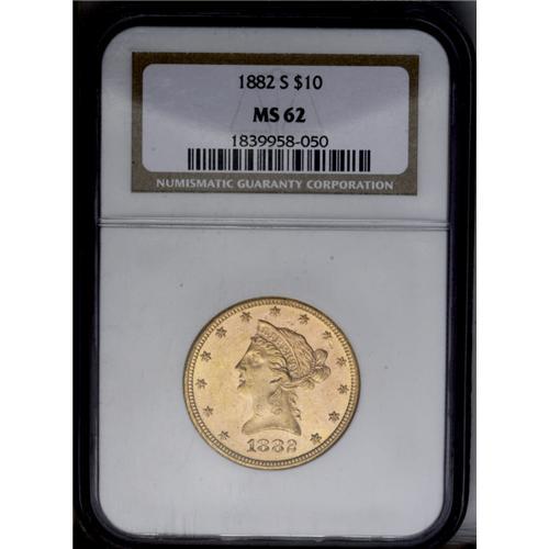 <B>1882-S<$10> MS62 NGC.</B></I> Potent luster brightens this sharply struck and typically marked Liberty ten. The 1882-S is scarce in all grades, and NGC has certified only one piece above the MS63 level. Census: 59 in 62, 18 finer (6/06).