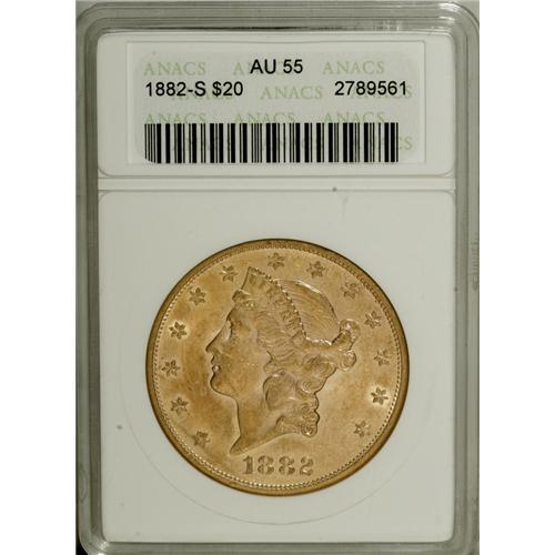 <B>1882-S $20 AU55 ANACS.</B></I> NGC Census: (40/907). PCGS Population (81/674). Mintage: 1,125,000. Numismedia Wsl. Price: $663. (#8998)<BR><BR><b>Shipping:</b> Coins & Currency (<a target="_blank" href="http://www.heritageauctions.com/common/shipping.php">view shipping information</a>)