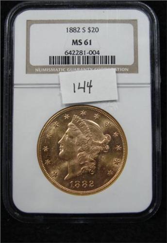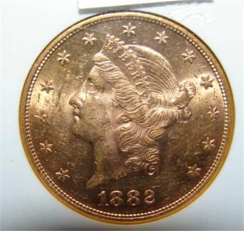 1882-S $20 LIBERTY GOLD COIN. Graded by NGC. MS 61. 642281-004.