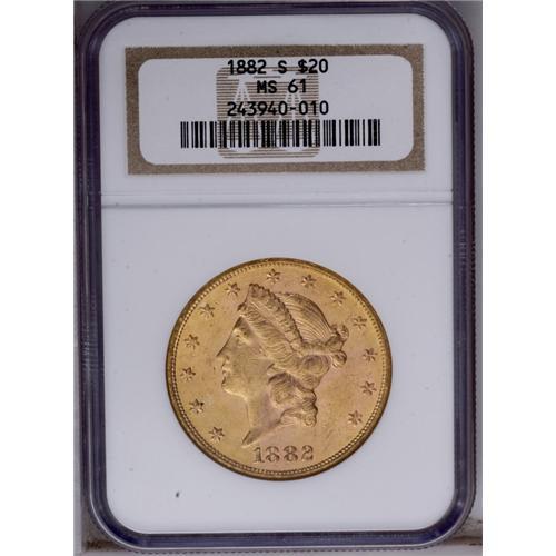 <B>1882-S<$20> MS61 NGC.</B></I> Peppered across both sides with small and medium sized marks. Good luster and color, from an issue that is difficult to locate in finer grades. <BR><BR><B>Important notice:</B> Heritage usually auctions material at the rate of 200-250 lots per hour. On some occasions eBay Live bid software or the Internet may not be able to keep up with the pace of the auction. We recommend placing a realistic absentee bid now as insurance to avoid disappointment. Occasionally the auctioneer may eliminate or reject an eBay Live bid, and the auctioneer may also reopen a lot after the close of the eBay live bidding (usually because we missed an audience bid), and may reject your bid even if it shows you as the winning bidder. By bidding via eBay Live, you agree that Heritage may award the lot to another bidder at its sole discretion under the circumstances described above or any other reasonable circumstances. Since eBay bids are not shown to us until we open the lot on the floor, we treat those bids just like floor bids. In most cases the floor responds before the eBay bid is presented to us, due to Internet lag time, so for consistency we have made it a policy that floor bids are always considered first over tie eBay live bids. Also please note that all Heritage lots purchased through eBay Live carry a 20% Buyer's Premium. Please make sure you read the Terms and Conditions before you bid. This lot is being auctioned in conjunction with a live floor auction by Heritage Galleries & Auctioneers. All final auction and invoice information will be supplied by Heritage Galleries & Auctioneers, and all other information should be considered preliminary. Lot:4286 <BR><BR><B>Winning Notification and Billing:</B> After the FINAL session in this auction is complete, Heritage will send e-mail and snail mail invoices. This process normally takes several days. All final auction and invoice information will be supplied by Heritage Galleries & Auctioneers, and all other information should be considered preliminary. <BR><BR>This auction will be conducted on a live auction floor and over the Internet through eBay Live. If you choose to place an absentee bid, please take a moment to <font color='#0000ff'><u><a href='http://pages.ebay.com/liveauctions/help/before/laabsentee.html'>learn how eBay Live absentee bidding works</a></u></font><font color='#000000'>