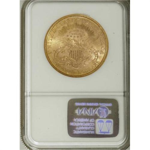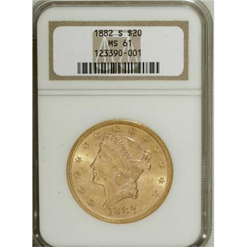 <B>1882-S $20 MS61 NGC.</B></I> NGC Census: (295/132). PCGS Population (176/250). Mintage: 1,125,000. Numismedia Wsl. Price for NGC/PCGS coin in MS61: $775. (#8998)<BR><BR><B>Coin Engraver:</B> James B. Longacre<BR><BR><b>Shipping:</b> Coins & Currency (<a target="_blank" href="http://www.heritageauctions.com/common/shipping.php">view shipping information</a>\)