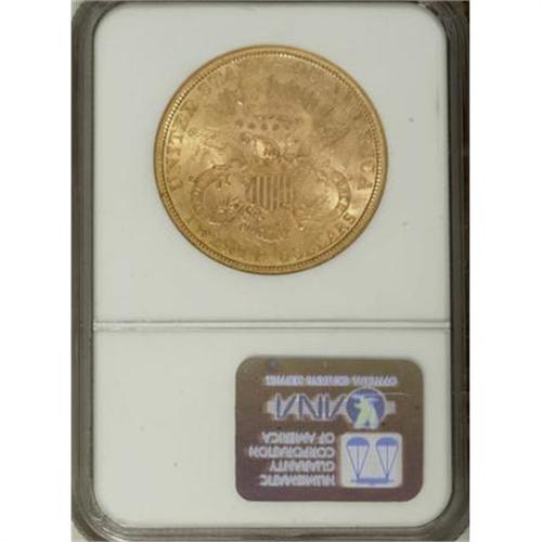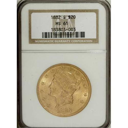 <B>1882-S $20 MS61 NGC.</B></I> NGC Census: (295/132). PCGS Population (176/250). Mintage: 1,125,000. Numismedia Wsl. Price for NGC/PCGS coin in MS61: $775. (#8998)<BR><BR><B>Coin Engraver:</B> James B. Longacre<BR><BR><b>Shipping:</b> Coins & Currency (<a target="_blank" href="http://www.heritageauctions.com/common/shipping.php">view shipping information</a>\)