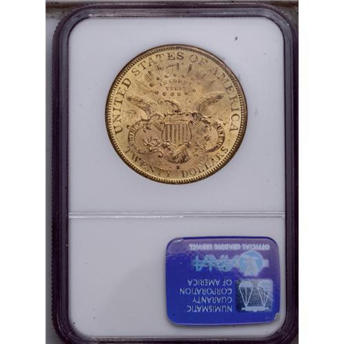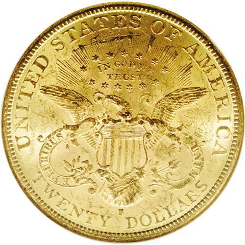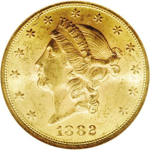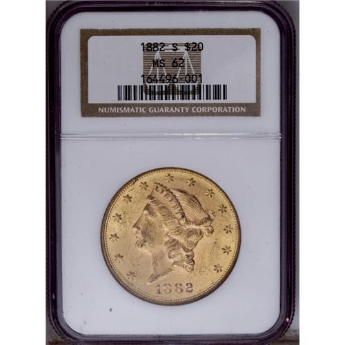 <B>1882-S<$20> MS62 NGC.</B></I> Salmon-pink centers are bounded by lime-gold peripheral hues. A fully lustrous albeit typically abraded example of this conditionally tough issue. The 1882-S is rare above the MS62 level. Between NGC and PCGS, only 42 pieces have been certified in MS63 and higher grades.