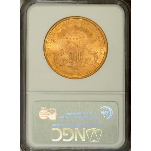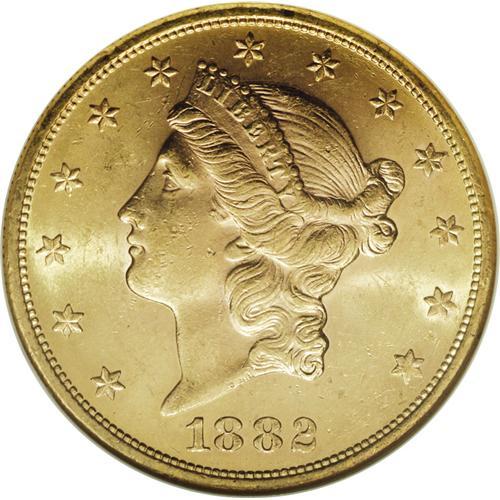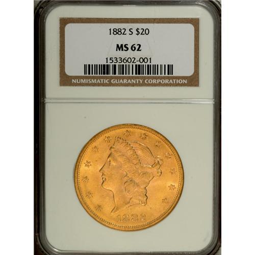<B>1882-S $20 MS62 NGC.</B></I> The certified population of this otherwise easily obtainable S-mint issue drops off abruptly above the present level of preservation. Orange-gold satiny luster covers the entire surface of the coin and reveals glowing fields that are typically abraded for the grade. Crisply struck, and conditionally scarce.<BR><BR><b>Shipping:</b> Coin/Currency (<a target="_blank" href="http://www.heritageauctions.com/common/shipping.php">view shipping information</a>)