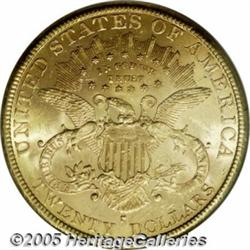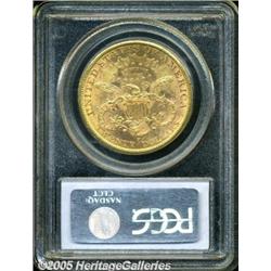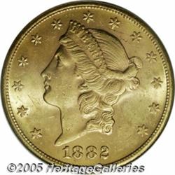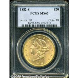 <B>1882-S $20 MS62 PCGS.</B></I> Although it is quite common as a date, the '82-S Double Eagle is an important condition rarity, and is virtually never seen finer than MS62. In fact, PCGS and NGC have only certified 27 finer examples of this issue. This example is quite sharply struck with all of Liberty's hair details well defined, and the first 11 stars completely detailed. Only stars 12 and 13 lack their central lines. The reverse is similarly sharply struck, a highly unusual phenomenon for this date. It is highly lustrous with frosty yellow-gold surfaces. Population: 185 in 62, 11 finer (2/05).
