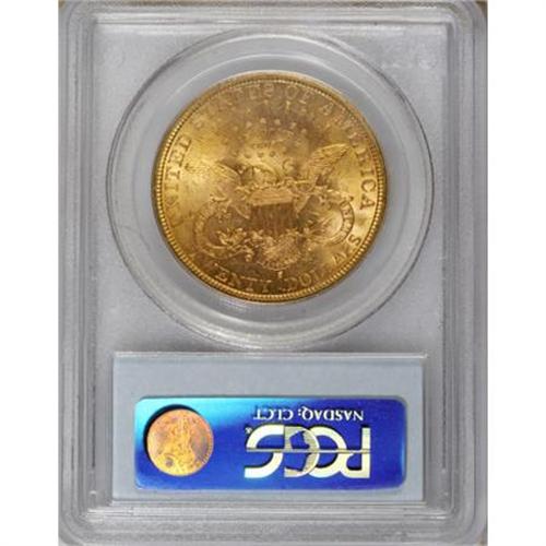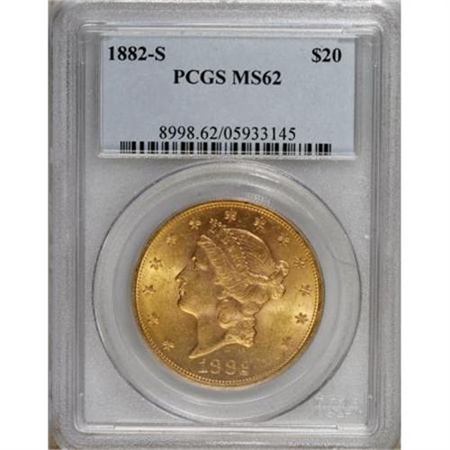 <B>1882-S $20 MS62 PCGS.</B></I> This shining orange-gold example has pleasing detail overall, though the last star displays weakness. By marks alone, the MS62 grade seems harsh, though the upper reverse displays a rim bruise as well. Still, an attractive example of this San Francisco issue.<BR><BR><b>Shipping:</b> Coins & Currency (<a target="_blank" href="http://www.heritageauctions.com/common/shipping.php">view shipping information</a>)