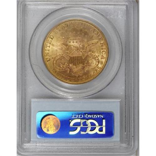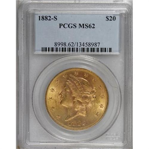 <B>1882-S $20 MS62 PCGS.</B></I> Lightly abraded surfaces are typical for these large gold coins, and the '82-S is seldom encountered any finer than this example. The surfaces are fully lustrous with frosty yellow brilliance that is enhanced by hints of pink toning. Only 30 finer submissions of the date have been considered by PCGS.<BR><BR><B>Coin Engraver:</B> James B. Longacre<BR><BR><b>Shipping:</b> Coins & Currency (<a target="_blank" href="http://www.heritageauctions.com/common/shipping.php">view shipping information</a>)