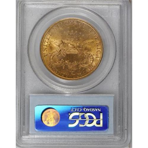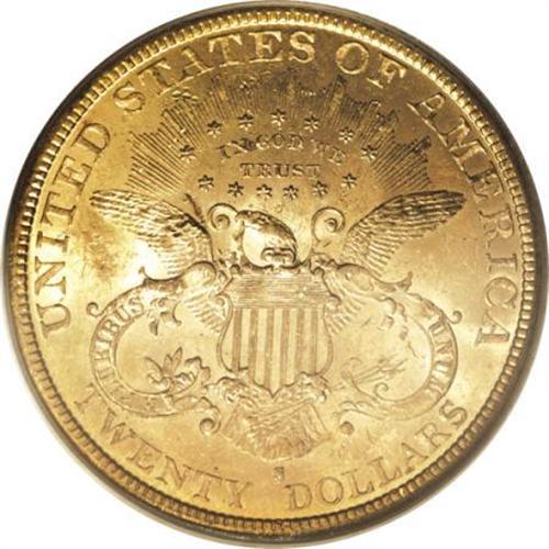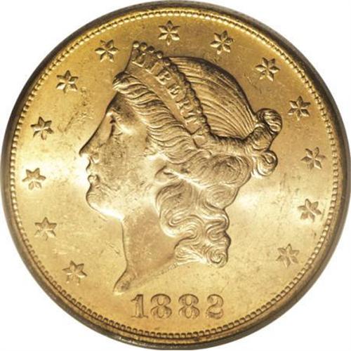 <B>1882-S $20 MS62 PCGS.</B></I> The 1882-S double eagle is a scarce date in Mint State, relative to its high original mintage of 1.125 million pieces. A mere 44 coins have been graded above MS62, by NGC and PCGS combined (8/07). This example is well struck and highly lustrous, with a mildly scuffy appearance that limits the grade. <BR><BR><B>Coin Engraver:</B> James B. Longacre<BR><BR><b>Shipping:</b> Coins & Currency (<a target="_blank" href="http://www.heritageauctions.com/common/shipping.php">view shipping information</a>)
