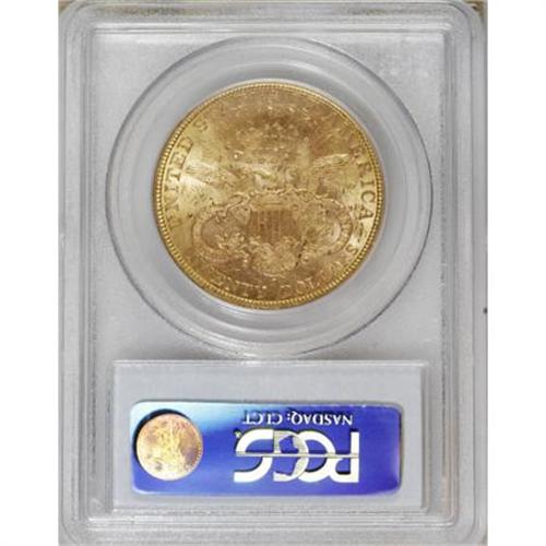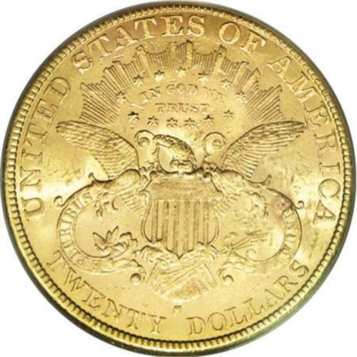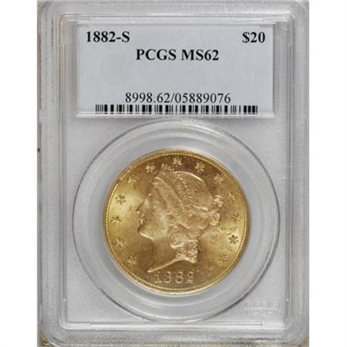 <B>1882-S $20 MS62 PCGS.</B></I> The typical 1882-S twenty displays a number of abrasions from having been shipped around the world in bags; consequently, most Mint State examples grade MS60 to MS62. The lustrous surfaces on this MS62 specimen display golden-green patina, and exhibit sharply struck design elements. A few minute contact marks are consistent with the grade.<BR><BR><B>Coin Engraver:</B> James B. Longacre<BR><BR><b>Shipping:</b> Coins & Currency (<a target="_blank" href="http://www.heritageauctions.com/common/shipping.php">view shipping information</a>)
