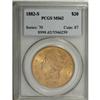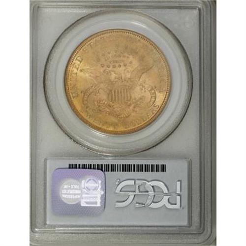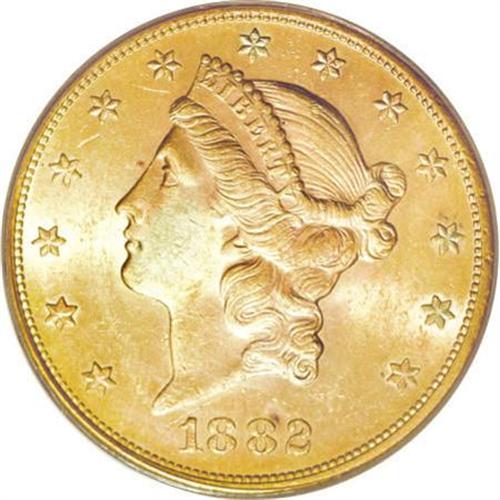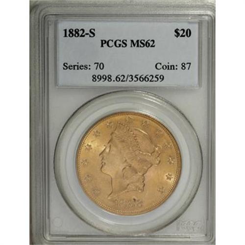 <B>1882-S $20 MS62 PCGS.</B></I> Intense satiny luster creates swirling cartwheel effects through the fields of this enticing example. The attractively toned surfaces exhibit coppery red-gold coloration. The devices are sharply struck, and there are only normal marks on each side, for the grade. This San Francisco Mint issue becomes very scarce any finer. <BR><BR><B>Coin Engraver:</B> James B. Longacre<BR><BR><b>Shipping:</b> Coins & Currency (<a target="_blank" href="http://www.heritageauctions.com/common/shipping.php">view shipping information</a>)