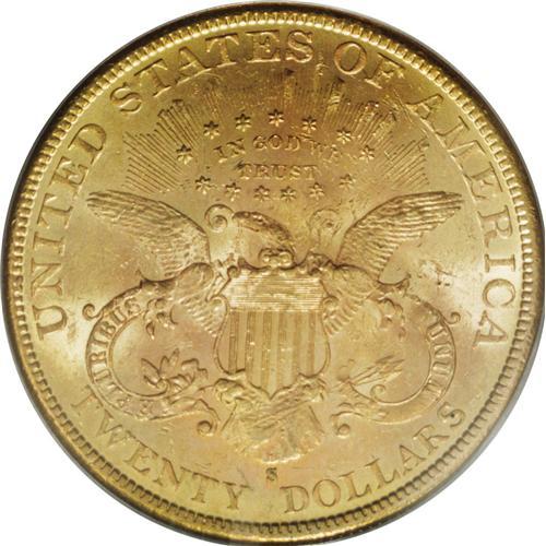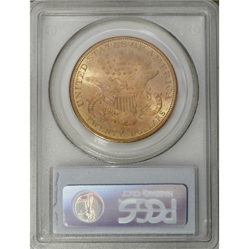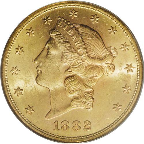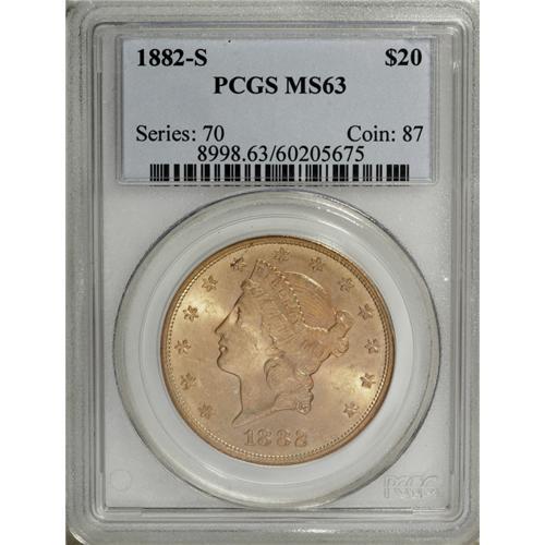 <B>1882-S $20 MS63 PCGS.</B></I> As is true with all of the S-mint double eagles from the 1880s, the 1882-S was struck in substantial numbers and can be found without too much difficulty in average Uncirculated grades. Mint State survivors are almost invariably very well struck and possess excellent luster characteristics. From the modern collector's perspective, problems arose with the way these coins were stored and transported. Heavy abrasions plague nearly all survivors to the extent that even a Select coin such as this is legitimately scarce. This example displays a vibrant, satiny appearance and is tinged in delicate orange patina. Population: 28 in 63, 1 finer (11/06).<BR><I>From The Kutasi Collection.</B></I><BR><BR><b>Shipping:</b> Coin/Currency (<a target="_blank" href="http://www.heritageauctions.com/common/shipping.php">view shipping information</a>)