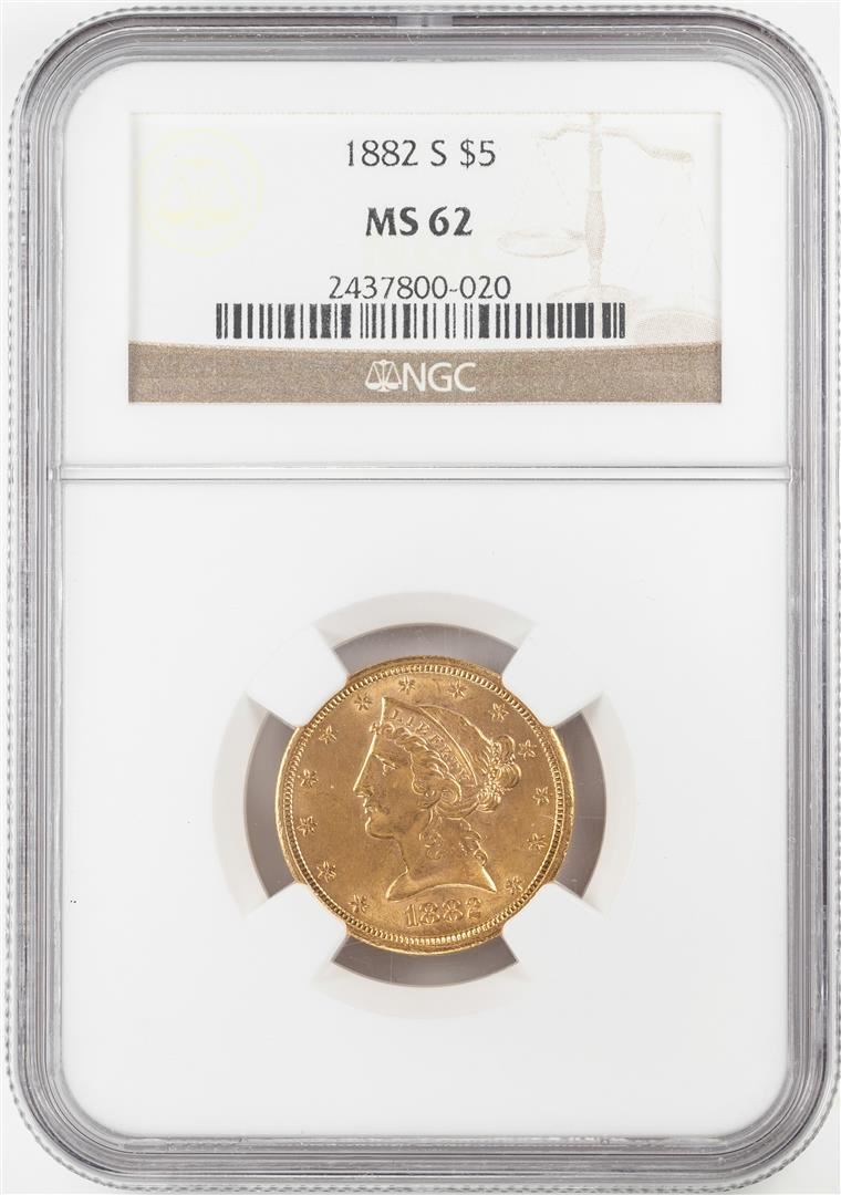 One 1882-S $5 Liberty Head Half Eagle Gold Coin NGC MS62. NGC Certified.