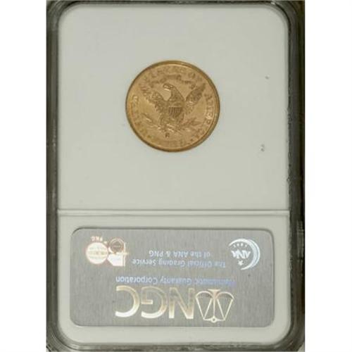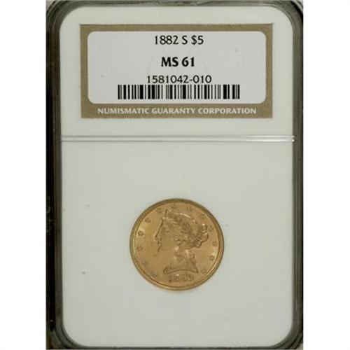 <B>1882-S $5 MS61 NGC.</B></I> NGC Census: (395/950). PCGS Population (148/662). Mintage: 969,000. Numismedia Wsl. Price for NGC/PCGS coin in MS61: $295. (#8360)<BR><BR><B>Coin Engraver:</B> Christian Gobrecht<BR><BR><b>Shipping:</b> Coins & Currency (<a target="_blank" href="http://www.heritageauctions.com/common/shipping.php">view shipping information</a>)