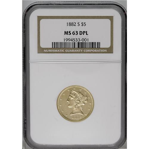 1882-S $5 MS63 Deep Prooflike NGC. A glittering, needl