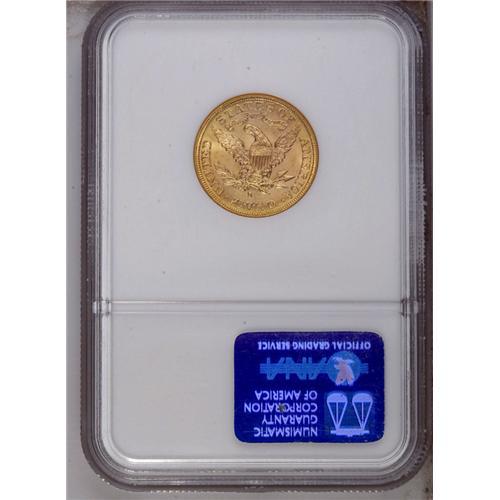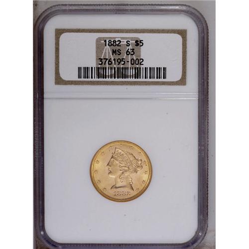 <B>1882-S $5 MS63 NGC.</B></I> Rich honey-gold surfaces with reddish hints on the reverse, abundant luster, a typically bold strike, and an excellent state of preservation. A few light scrapes on Liberty's cheek and abrasions in the obverse fields limit the grade. The reverse is choice for the grade. Light strike doubling is visible on the reverse.