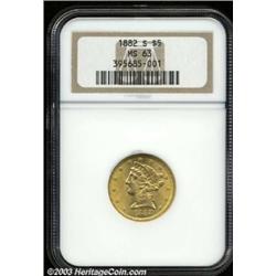 <TABLE cellSpacing=0 cellPadding=0 width="100%" bgColor=#000000 border=0><TBODY><TR><TD width="100%"><TABLE cellSpacing=1 cellPadding=3 width="100%" border=0><TBODY><TR><TD width="100%" bgColor=#79735c><FONT face=arial color=#ffffff size=3><B>Description</B> </FONT></TD></TR><TR><TD width="100%" bgColor=#ffffff><FONT face=arial size=2><B>1882-S $5 MS63 NGC.</B></I> Sharply defined with shimmering bright luster and a few trivial contact marks overall. </FONT></TD></TR></TBODY></TABLE></TD></TR></TBODY></TABLE><BR><A name=PricesRealized></A><TABLE cellSpacing=0 cellPadding=0 width="100%" bgColor=#000000 border=0><TBODY><TR><TD width="100%"><TABLE cellSpacing=1 cellPadding=3 width="100%" border=0><TBODY><TR><TD width="100%" bgColor=#79735c><A name=PR><FONT face=arial color=#ffffff size=3><B>Previous Prices from Heritage Auctions</B> </FONT></A></TD></TR><TR><TD bgColor=#f6f6ed><TABLE cellSpacing=0 cellPadding=0 width="100%" border=1><TBODY><TR><TD align=middle width="33%"><B>Date</B></TD><TD align=middle width="33%"><B>Service</B></TD><TD align=middle width="33%"><B>Price</B></TD></TR><TR bgColor=whitesmoke><TD width="33%"><B>06/10/2002</B></TD><TD width="33%">NGC</TD><TD width="33%">$425.50</TD></TR><TR bgColor=whitesmoke><TD width="33%"><B>11/27/2001</B></TD><TD width="33%">NGC</TD><TD width="33%">$440.00</TD></TR><TR bgColor=whitesmoke><TD width="33%"><B>10/06/2001</B></TD><TD width="33%">NGC</TD><TD width="33%">$345.00</TD></TR><TR bgColor=whitesmoke><TD width="33%"><B>06/27/2000</B></TD><TD width="33%">NGC</TD><TD width="33%">$525.00</TD></TR><TR bgColor=whitesmoke><TD width="33%"><B>10/01/1998</B></TD><TD width="33%">NGC</TD><TD width="33%">$660.00</TD></TR><TR bgColor=whitesmoke><TD width="33%"><B>08/29/2000</B></TD><TD width="33%">NGC</TD><TD width="33%">$490.00</TD></TR><TR bgColor=whitesmoke><TD width="33%"><B>10/06/2000</B></TD><TD width="33%">PCGS</TD><TD width="33%">$414.00</TD></TR><TR bgColor=whitesmoke><TD width="33%"><B>03/01/1993</B></TD><TD width="33%">PCGS</TD><TD width="33%">$1,760.00</TD></TR><TR bgColor=whitesmoke><TD width="33%"><B>02/01/1991</B></TD><TD width="33%">PCGS</TD><TD width="33%">$1,320.00</TD></TR><TR bgColor=whitesmoke><TD width="33%"><B>06/25/2002</B></TD><TD width="33%">NGC</TD><TD width="33%">$471.50</TD></TR></TBODY></TABLE></TD></TR><TR><TD bgColor=#ffffff><FONT face=arial size=1 ?>PLEASE NOTE: All prices realized reflect the final hammer price PLUS the buyer's premium in auctions that charge a buyer's premium. Each item has a notation at the top of the listing indicating whether that lot included a buyer's premium. Example: A item that sells with a final hammer price of $100 and a 20% buyer's premium will display with a price realized of $120. All information listed is intended to be as accurate as possible, but errors are possible. Please use this guide carefully and inform us of any inaccuracies. </FONT></TD></TR></TBODY></TABLE></TD></TR></TBODY></TABLE><BR><TABLE cellSpacing=0 cellPadding=0 width="100%" bgColor=#000000 border=0><TBODY><TR><TD width="100%"><TABLE cellSpacing=1 cellPadding=3 width="100%" border=0><TBODY><TR><TD width="100%" bgColor=#79735c colSpan=6><FONT face=arial color=#ffffff size=3><B>Price Guide*</B> </FONT></TD></TR><TR bgColor=#f6f6ed><TD align=middle><B>Grade</B> </TD><TD align=middle><B>Coin World<BR>(Trends)</B> </TD><TD align=middle><B>Numismedia<BR>Retail</B> </TD><TD align=middle><B>Numismedia<BR>Wholesale</B> </TD><TD align=middle><B>Coin<BR>Universe</B> </TD><TD align=middle><B>Heritage<BR>Value Index</B> </TD></TR><TR bgColor=#ffffff><TD align=middle>62</TD><TD align=right>$350.00</TD><TD align=right>$325.00</TD><TD align=right>$260.00</TD><TD align=right>$300.00</TD><TD align=right>$266.13</TD></TR><TR style="FONT-WEIGHT: bold" bgColor=#cccfdd><TD align=middle>63</TD><TD align=right>$1,025.00</TD><TD align=right>$780.00</TD><TD align=right>$625.00</TD><TD align=right>$750.00</TD><TD align=right>$636.38</TD></TR><TR bgColor=#ffffff><TD align=middle>64</TD><TD align=right>$2,050.00</TD><TD align=right>---</TD><TD align=right>$975.00</TD><TD align=right>$1,000.00</TD><TD align=right>$1,026.88</TD></TR><TR bgColor=#ffffff><TD colSpan=6><FONT size=1>*All information listed is intended to be as accurate as possible, but errors are possible. No item may be returned or refused based on this information which is provided as a service to our customers. You should contact each pricing source directly to determine the accuracy of this information. </FONT></TD></TR></TBODY></TABLE></TD></TR></TBODY></TABLE><BR><TABLE cellSpacing=0 cellPadding=0 width="100%" bgColor=#000000 border=0><TBODY><TR><TD width="100%"><TABLE cellSpacing=1 cellPadding=3 width="100%" border=0><TBODY><TR><TD width="100%" bgColor=#79735c><FONT face=arial color=#ffffff size=3><B>Population Guide</B> </FONT></TD></TR><TR bgColor=#ffffff><TD align=middle><!-- Begin Output of Population Grid--><TABLE cellSpacing=0 cellPadding=0 width="100%" border=0><TBODY><TR><TD vAlign=center><TABLE cellSpacing=0 width="100%" border=1 cellsadding="3"><TBODY><TR><TD vAlign=center><TABLE cellSpacing=0 cellPadding=3 width="100%" border=1><TBODY><TR><TD vAlign=center align=middle bgColor=#f0f1e8 colSpan=2 <CENTER><FONT face=Arial size=2><B>PCGS Pop </B></FONT><CENTER></CENTER></TD><TD vAlign=center align=middle bgColor=#f0f1e8 colSpan=2><CENTER><FONT face=Arial size=2><B>NGC Pop</B></CENTER></FONT></TD></TR><TR><TD vAlign=center><FONT face=Arial size=2>(63)</FONT> </TD><TD vAlign=center align=right><FONT face=Arial size=2>155</FONT> </TD><TD vAlign=center><FONT face=Arial size=2>(63)</FONT> </TD><TD vAlign=center align=right><FONT face=Arial size=2>189</FONT> </TD></TR><TR><TD vAlign=center><FONT face=Arial size=2>(>63)</FONT> </TD><TD vAlign=center align=right><FONT face=Arial size=2>72</FONT> </TD><TD vAlign=center><FONT face=Arial size=2>(>63)</FONT> </TD><TD vAlign=center align=right><FONT face=Arial size=2>103</FONT> </TD></TR></TBODY></TABLE></TD></TR></TBODY></TABLE></T
