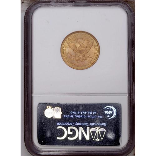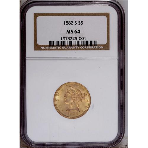 <B>1882-S<$5> MS64 NGC.</B></I> Suitably struck and thoroughly lustrous with attractive orange and lime coloration. The absence of distracting marks confirms the MS64 grade.