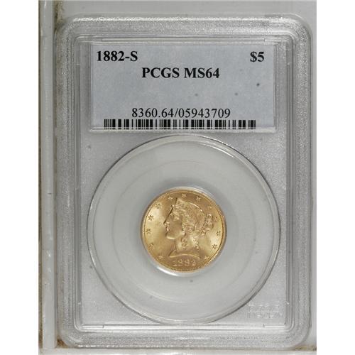 <B>1882-S $5 MS64 PCGS.</B></I> Broad shelf doubling occurs on the mintmark and on some of the reverse peripheral lettering. This intensely lustrous example seems conservatively graded, with better-than-average eye appeal for a near-Gem. It is well struck with absolutely minimal marks for the grade. Population: 89 in 64, 9 finer (3/07).<BR><BR><b>Shipping:</b> Coins & Currency (<a target="_blank" href="http://www.heritageauctions.com/common/shipping.php">view shipping information</a>)