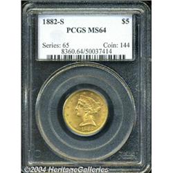 <B>1882-S<$5> MS64 PCGS.</B></I> The overall sharp strike is typical for S-mint Half Eagle production from this era, but the level of surface preservation is not at all common for a gold coin of this size. There are just a few well scattered abrasions, and both sides exhibit a lustrous, rose-gold sheen. <BR><BR><B>Important notice:</B> Heritage usually auctions material at the rate of 200-250 lots per hour. On some occasions eBay Live bid software or the Internet may not be able to keep up with the pace of the auction. We recommend placing a realistic absentee bid now as insurance to avoid disappointment. Occasionally the auctioneer may eliminate or reject an eBay Live bid, and the auctioneer may also reopen a lot after the close of the eBay live bidding (usually because we missed an audience bid), and may reject your bid even if it shows you as the winning bidder. By bidding via eBay Live, you agree that Heritage may award the lot to another bidder at its sole discretion under the circumstances described above or any other reasonable circumstances. Since eBay bids are not shown to us until we open the lot on the floor, we treat those bids just like floor bids. In most cases the floor responds before the eBay bid is presented to us, due to Internet lag time, so for consistency we have made it a policy that floor bids are always considered first over tie eBay live bids. Also please note that all Heritage lots purchased through eBay Live carry a 20% Buyer's Premium. Please make sure you read the Terms and Conditions before you bid.
