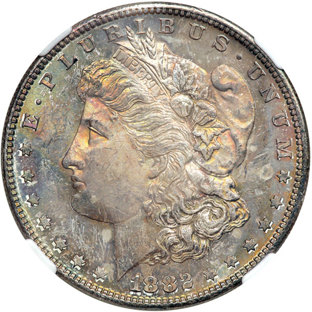 1882-S Morgan Dollar. NGC graded MS-64. Lovely golden obverse toning while the reverse remains fully white (PCGS # 7140) .